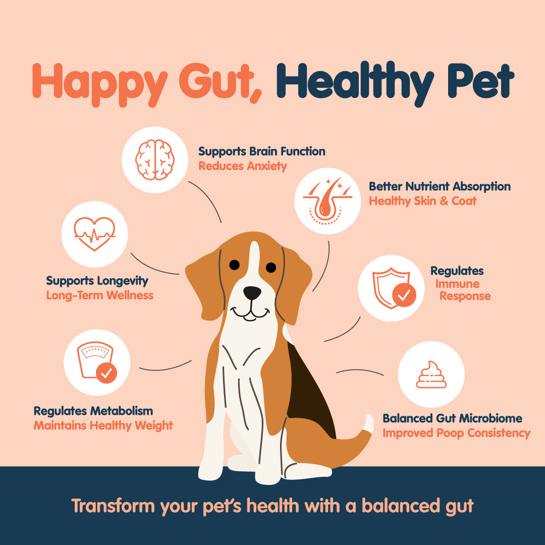 A healthy gut supports brain function, helps regulate immune response, longevity, nutrient absorption and helps to regulate metabolism. A happy gut means a happy pet and this comes with a host of benefits including reduced anxiety, a strong immune system, long term wellness, healthy skin and coat, improved poop consistency and maintaining a healthy weight.
