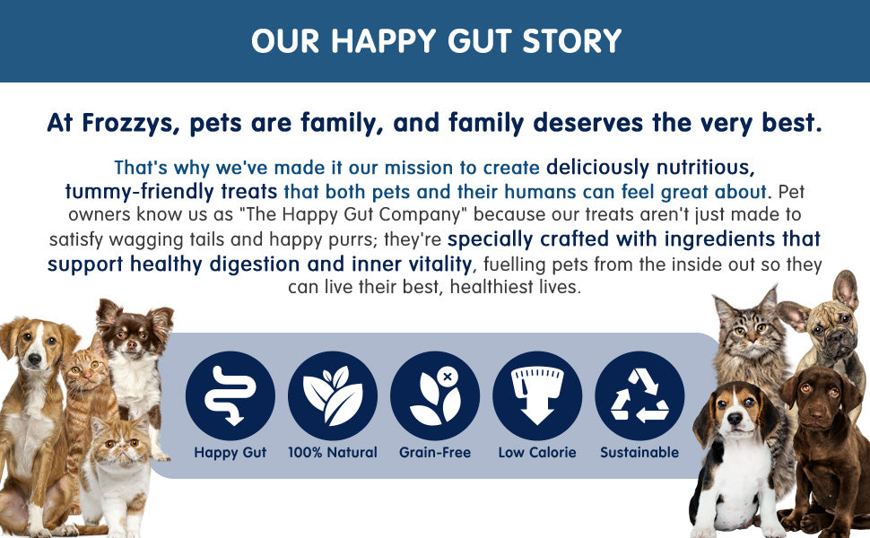 Frozzys is a healthy frozen yogurt treat for your dog. It's cooling and soothing, lactose free and low-calorie. Frozzys is gentle on your pets sensitive digestive system yet so tasty they'll be panting for more!