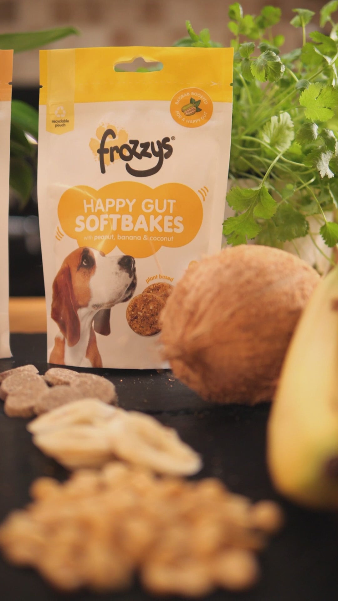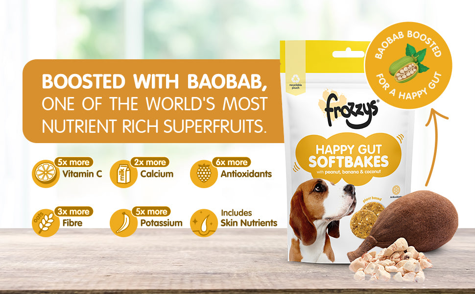 Frozzys Happy Gut Softbakes are natural, soft & chewy treats for a happy gut. Boosted with Baobab, Softbakes boast the following benefits for your dog: